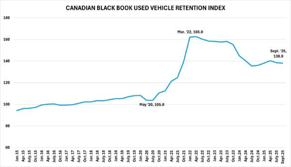 The Canadian Black Book Used Vehicle Retention Index is calculated using Canadian Black Book’s published Wholesale Average value on two- to six-year-old used vehicles, as percent of original typically equipped MSRP. Canadian Black Book’s Wholesale Average is a benchmark value for used vehicles selling in the wholesale auctions with the vehicle quality in Average condition. The index is weighted based on used vehicle registration volume and adjusted for vehicle age, mileage, condition, and inflation (MSRP).
