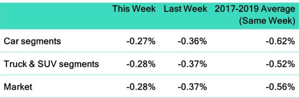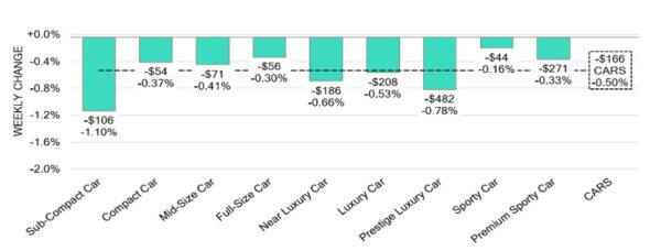 - The smallest declines were seen in Full-Size Van (-0.15%), Full-Size Luxury Crossover/SUV (-0.18%), and Compact Crossover/SUV (-0.30%).