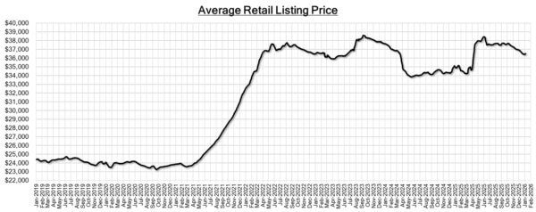 The average listing price for used vehicles is slightly decreasing, as the 14-day moving average was at $36,520. This analysis is based on approximately 206,460 used vehicles listed for sale on Canadian dealer lots.