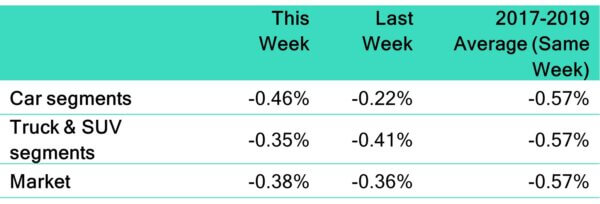 - Last week values softened for trucks, with the overall segment down 0.52% and broad declines across most crossover, van, and pickup categories.