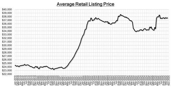 The average listing price for used vehicles is slightly decreasing, as the 14-day moving average was at $37,420. This analysis is based on approximately 220,000 used vehicles listed for sale on Canadian dealer lots.