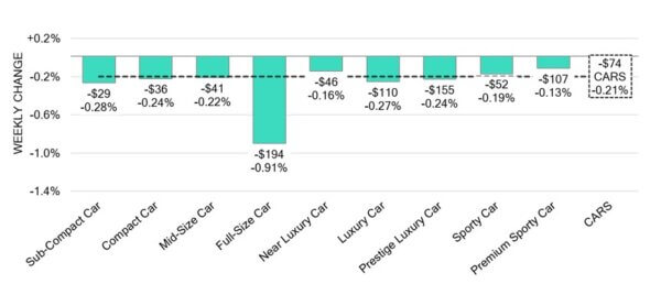 - Segments with the largest drops was seen in Full-Size Car (-0.91%), Sub-Compact Car (-0.28%), and Luxury Car (-0.27%).