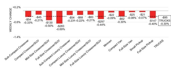 - Those with the largest reductions were Full-Size Crossover/SUV (-0.69%) followed by Mid-Size Crossover/SUV (-0.50%) and Full-Size Crossover/SUV (-0.44%).