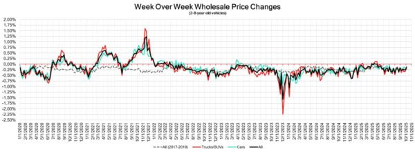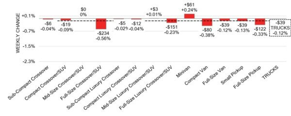 - The largest declines were in Full-Size Crossover/SUV (-0.56%), Compact Van (-0.38%), and Full-Size Pickup (-0.33%).