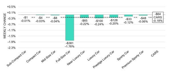 - The largest drops were in Full-Size Car (-1.76%), Luxury Car (-0.24%), and Near Luxury Car (-0.22%).