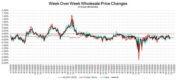 - The market continues to follow typical seasonal depreciation patterns, with an overall decline of -0.51%, aligning closely with the pre-pandemic average depreciation rate of -0.53%. Last week, while auction inventory increased, conversion rates decreased to an average of 57%, compared to the consistent 58% seen in recent weeks.