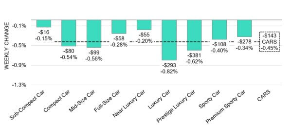 - The Compact Car (-0.04%) segment decreased the least with Luxury Car (-0.05%) and Premium Sporty Car (-0.13%) coming in close behind.