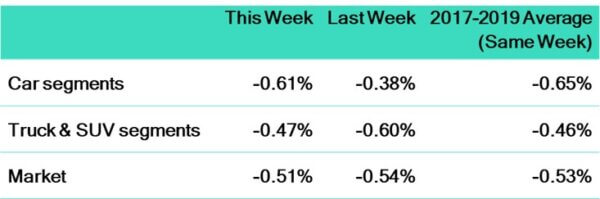 - Car segments saw an overall decline of -0.18% last week with all nine segments trending downwards.