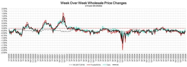- Despite winter weather affecting large portions of the country, depreciation shifted to appreciation last week across several segments, with the overall 2-to-8-year-old market increasing +0.05%. The overall market had not posted a January gain since 2021. While value increases in the first quarter are typical ahead of the spring and tax-season lift, gains occurring this early in the year remained atypical.