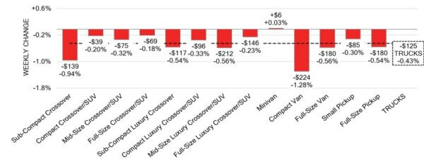 - At the more stable end of the market, Minivan rose (+0.03%), while Full-Size Crossover/SUV (-0.18%) and Compact Crossover/SUV (-0.20%) recorded the smallest declines.