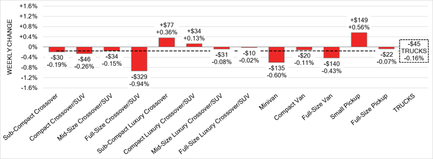 - Segments with the largest declines were Full-Size Crossover/SUV (-0.94%), Minivan (-0.60%) and Full-Size Van (-0.43%).