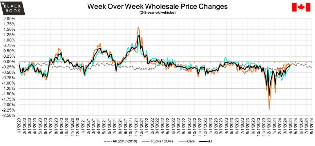 The Canadian used wholesale market saw a decline in prices for the week at –0.17%. The Car segment fell by –0.19% and the Truck/SUVs segment prices declined –0.16%. 5 out of 22 segments’ values have increased for the week. The Small Pickup segment increased by 0.56% followed by the Sub-Compact Luxury Crossover segment which rose by 0.36%. The segments with the largest declines were Full-Size Luxury Crossover/SUV at –0.94% followed by Compact Car at –0.80%.