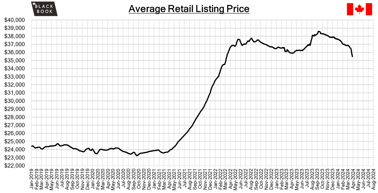The average listing price for used vehicles was slightly down week-over-week, as the 14-day moving average was at $35,500. Analysis is based on approximately 220,000 used vehicles listed for sale on Canadian dealer lots.