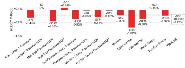 - The largest dives appeared in compact Van (-1.02%), Mid-Size Crossover/SUV (-0.63%), Sub-Compact Luxury Crossover (-0.52%) and Full-Size Van (-0.50%).