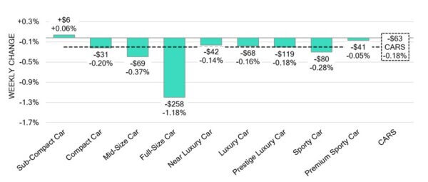 - Those with the largest drop in values were Full-Size Car (-1.18%), Mid-Size Car (-0.37%), and Sporty Car (-0.28%).