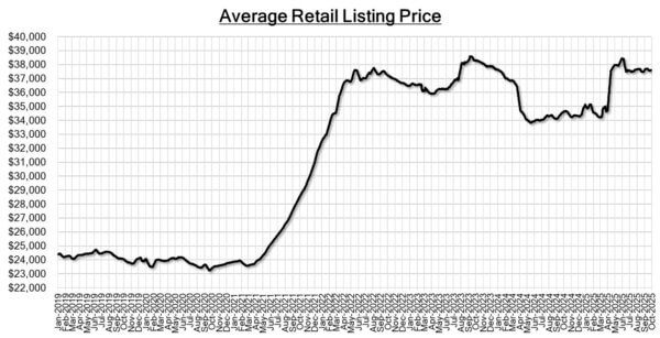 The average listing price for used vehicles is slightly decreasing, as the 14-day moving average was at $37,600. This analysis is based on approximately 220,000 used vehicles listed for sale on Canadian dealer lots.